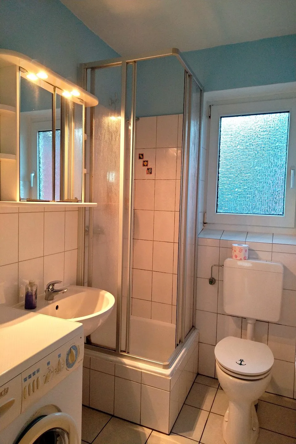 Das Badezimmer verfügt über eine Dusche sowie eine Waschmaschine – praktisch besonders bei längeren Aufenthalten.