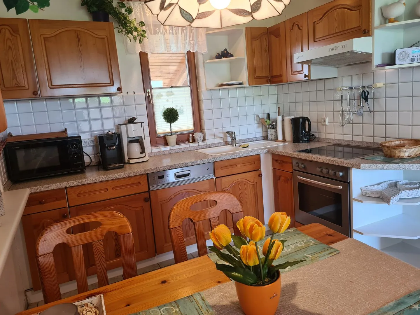 Die Küche ist komplett ausgestattet mit Ceran- Kochfeld, Backofen, Geschirrspülmaschine, kombinierter Kühl- Gefrierkombination, Kaffeemaschine, Wasserkocher, Toaster.