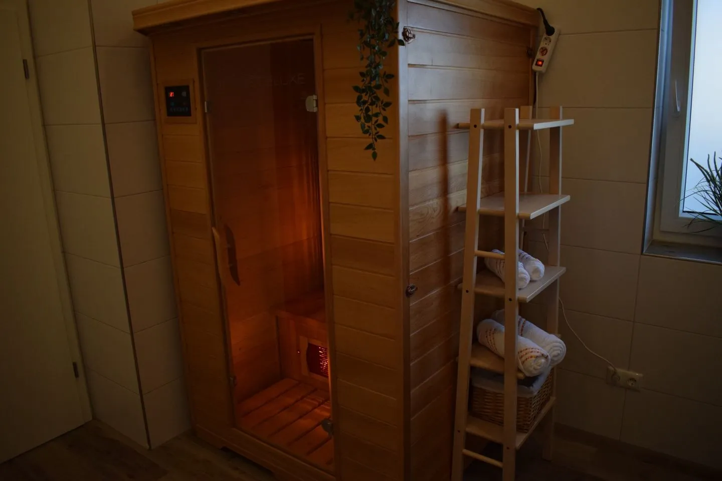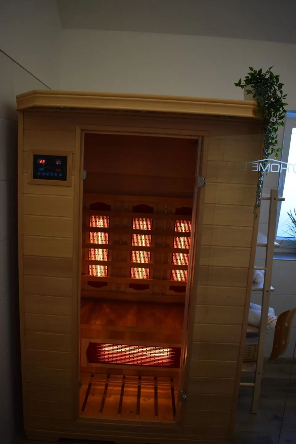 Das große Badezimmer ist ein Wellnessbereich mit großer Regendusche und einer Infrarotkabine, die nach langen Spaziergängen zum Aufwärmen einlädt.