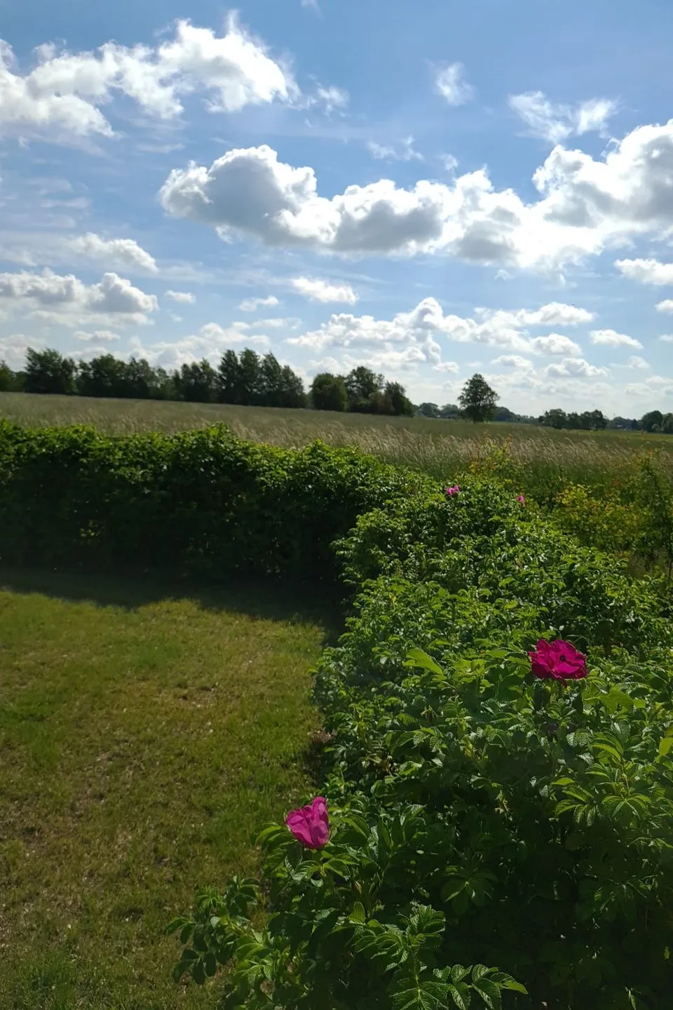 Von der Südost-Terrasse auf dem 400 qm Grundstück, das von Heckenrosen eingegrenzt ist, ist ein freier Blick auf die Wiesen mit Pferden, Kühen und auch den Rehen, aber auch zu Falken, Fasanen und Feldhasen möglich.