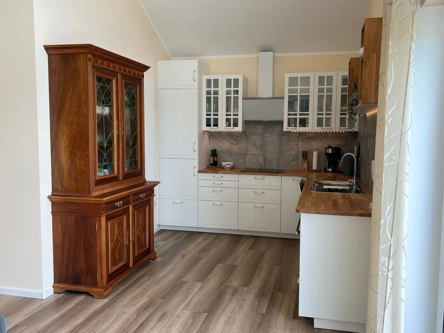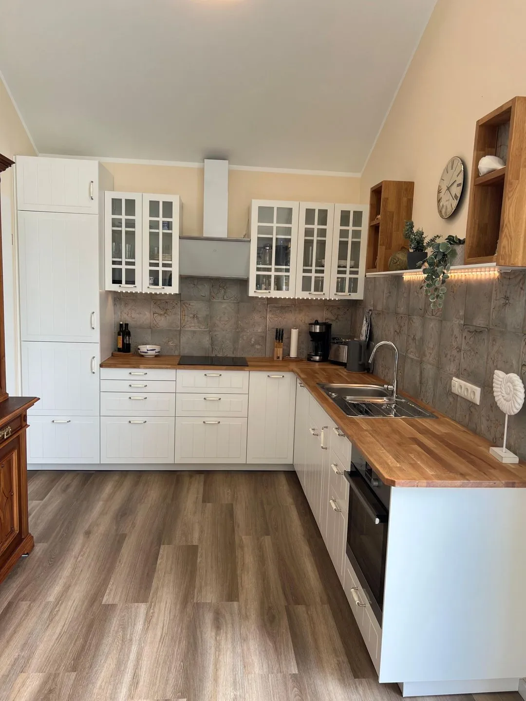 Das Haus bietet auf einer Ebene ca. 83 qm Wohnfläche. Der offene Wohn- und Küchenbereich verfügt über eine hochwertige Ausstattung (Kühlschrank, Gefrierschrank, Geschirrspülmaschine, Backofen, Mikrowelle, Glaskeramik-Kochfeld, Kaffeemaschine, Toaster, Waffeleisen) und einen großen Holztisch für 6 Personen. Gegenüber einer Leder-Sofalandschaft befindet sich ein großer Fernseher mit Satelliten- und Breitband-Internetanschluss.