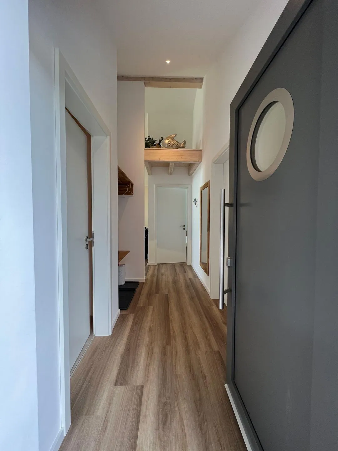 Durch das moderne Bad mit ebenerdiger Dusche erreichen Sie einen Extraraum mit einer Sauna (für ca. 3-4 Personen) und einer Waschmaschine.