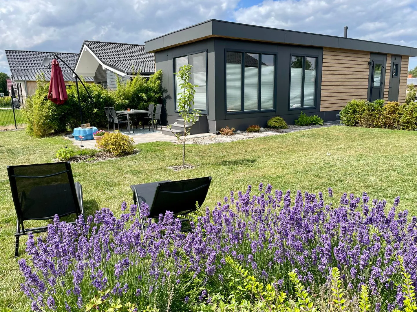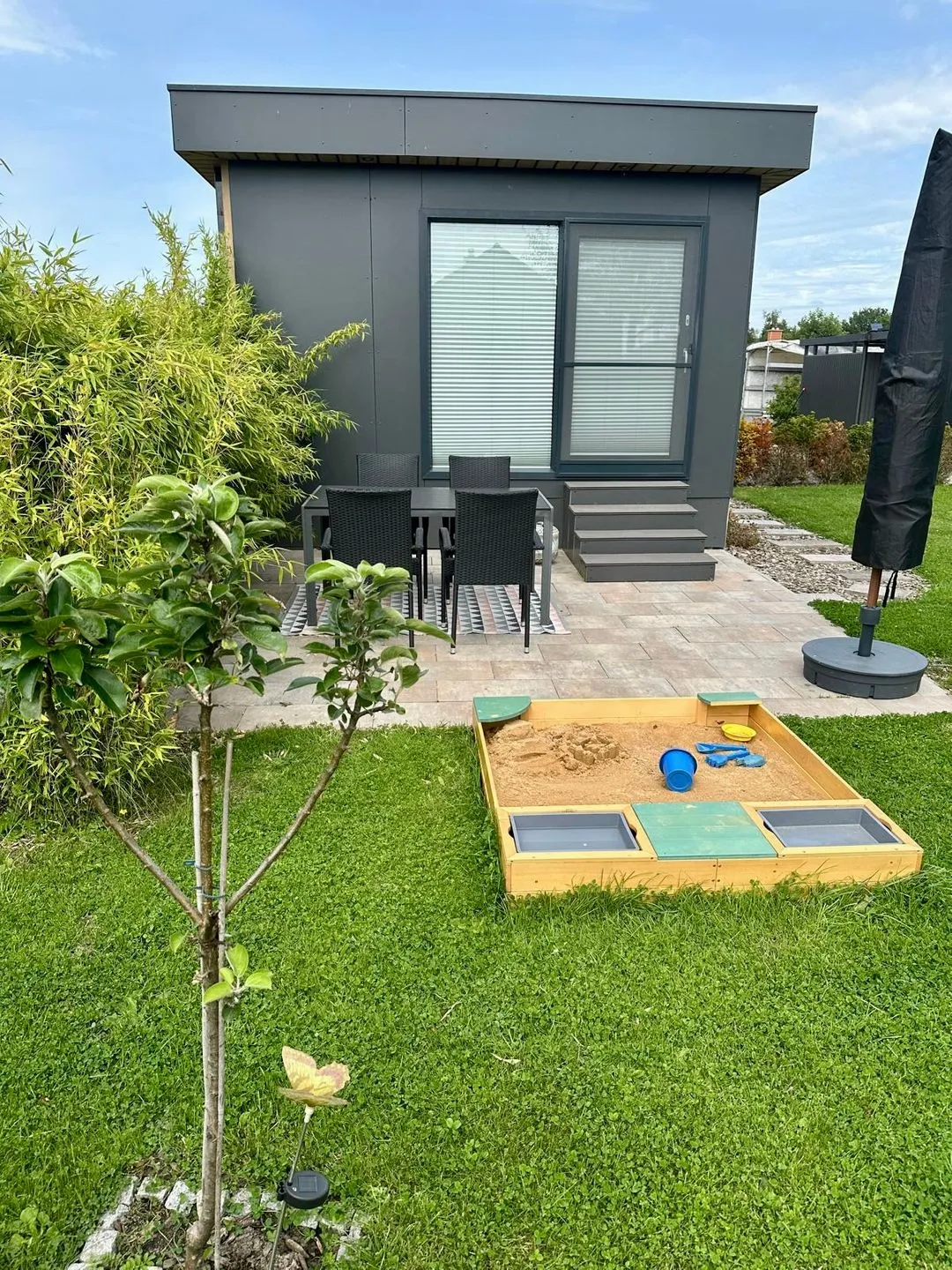 Sonnenterasse mit Sonnenschirm, Gartenmöbeln und einem Holzkohlegrill