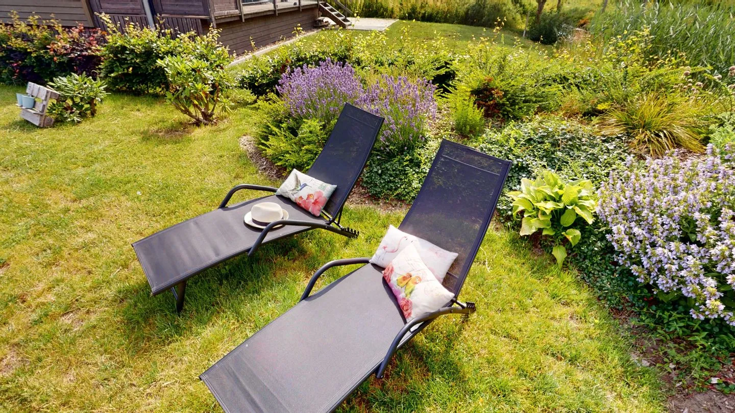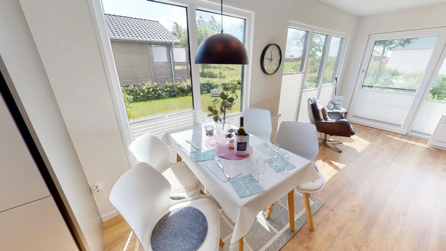 Die MeerAuszeit verwöhnt auf 50 qm mit moderner, allergikerfreundlicher Einrichtung. Große Panoramafenster und die sonnige Terrasse schenken einen herrlichen Blick in den Garten mit Obstbäumen und Kräutern.