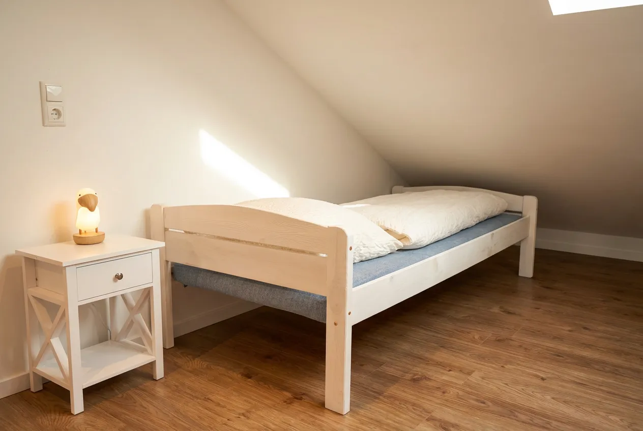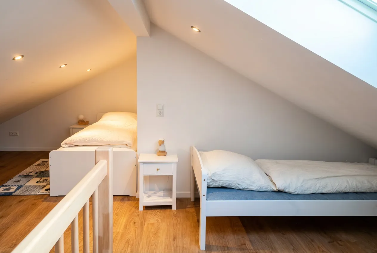 Das Wohnzimmer ist mit Sofa und Lesesessel gemütlich eingerichtet und verfügt über einen Smart-TV und eine Stereoanlage. Der Essbereich bietet Platz für 6 Personen an einem großen Tisch mit bequemen Stühlen. An kühlen Abenden können Sie den modernen Kaminofen nutzen. Es gibt zwei Schlafzimmer, von denen eines rollstuhlgerecht ist. In einem Schlafraum steht im unteren Bereich ein Doppelbett, ein Fernseher ist an der gegenüberliegenden Wand angebracht. Eine kleine geschlossene Holztreppe (Kindersicher mit Törchen) führt nach oben in die Dachgalerie. In dem Bereich sind zwei Einzelbetten optimal als ganz eigener Schlaf-und Spielbereich für Kinder.
