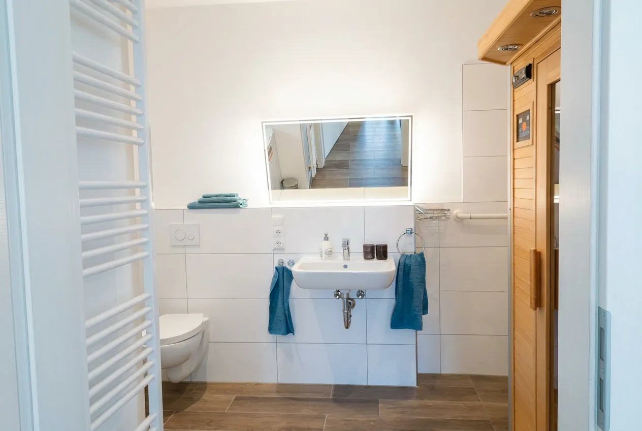 Das Wieken-Huus bietet besonders Menschen mit Gehbehinderung eine gute Grundausstattung. Schwellenlosen Zugang zur Haustür und Terrasse. Alle Türen sind 100cm breit, das Bad verfügt über eine ebenerdige Dusche mit Duschhocker und 2 Haltegriffen. Auch neben der Toilette befindet sich ein Griff. Der Spiegel ist gekippt, somit ist das Frisieren im Sitzen kein Problem. Im Bad befindet sich eine Infrarotsauna, die Badzimmertür geht zur Sicherheit nach außen auf. Waschmaschine, Trockner, Wäscheständer und Bügeleisen sind ebenfalls vorhanden. Zu Ihrer Sicherheit sind Rauchmelder, sowie ein Feuerlöscher installiert, der Erste-Hilfe-Koffer ist vorhanden.
